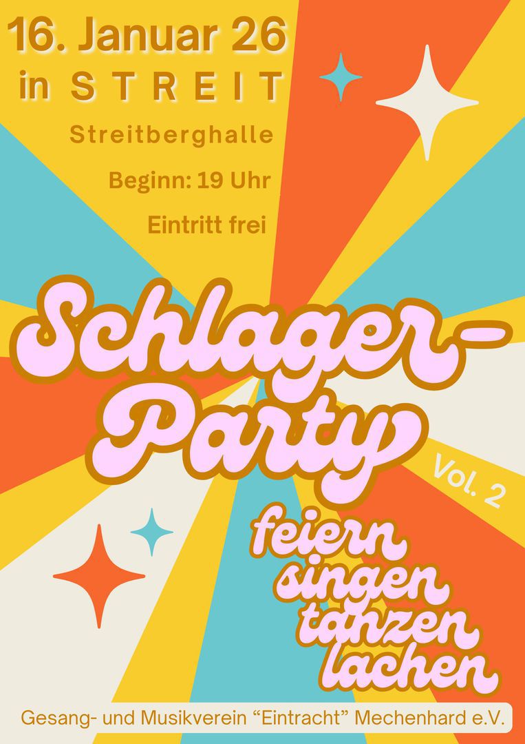 Unter dem Motto „feiern, singen, tanzen, lachen“ laden wir am Freitag, 16.01.2026, herzlich ein zu unserer zweiten Schlagerparty in der Streitberghalle in Streit. Beginn ist um 19 Uhr.