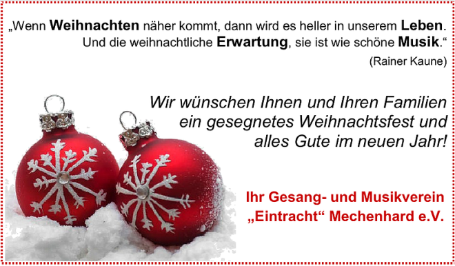 Musik, Gesang und festliche Orgelklänge zur Weihnachtszeit präsentiert der Gesang- und Musikverein „Eintracht“ Mechenhard am dritten Adventssonntag, 15. Dezember 2024, um 17 Uhr bei seinem Adventskonzert in der Mechenharder Pfarrkirche St. Josef.