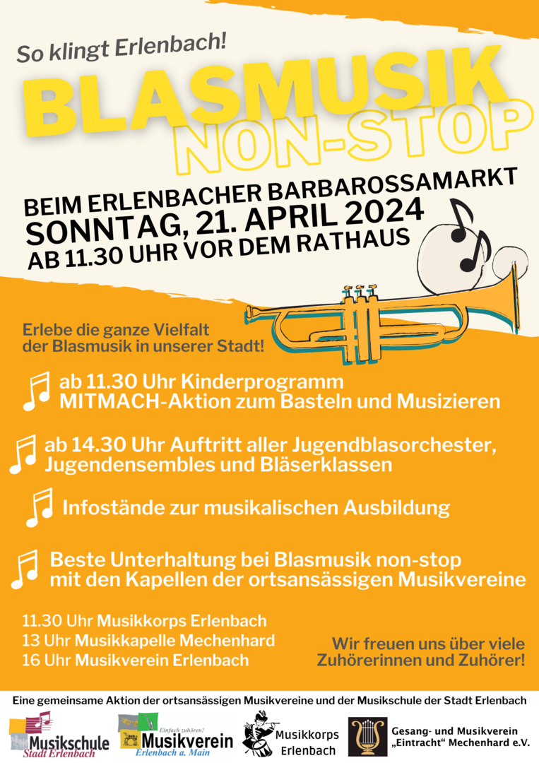 „Blasmusik non-stop“ lautet das Motto beim Barbarossamarkt am Sonntag, 21.04.2024, in Erlenbach. Am Platz vor dem Rathaus ist ab 11.30 Uhr in einer gemeinsamen Aktion der ortsansässigen Musikvereine und der Musikschule Erlenbach die ganze Vielfalt der Blasmusik in unserer Stadt zu erleben.