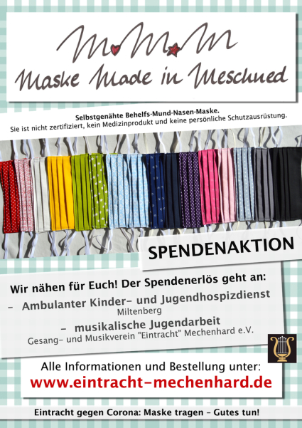 Gesundheit ist das Wichtigste! Daher möchte auch unser Verein einen Beitrag in dieser für uns alle sehr außergewöhnlichen Situation leisten. Unter dem Motto „Maske tragen – Gutes tun“ haben wir eine Spendenaktion ins Leben gerufen: Wir nähen für Euch Masken made in Meschned!