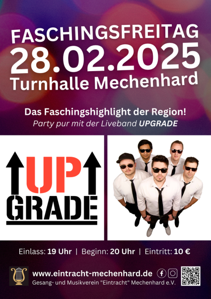 Alle Musik- und Partyfans von Jung bis Alt sind zum großen Faschingstanz in Mechenhard mit UPGRADE herzlich eingeladen. Der Gesang- und Musikverein "Eintracht" Mechenhard freut sich wieder auf eine tolle Faschingsfreitagsfete!